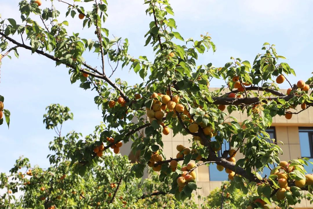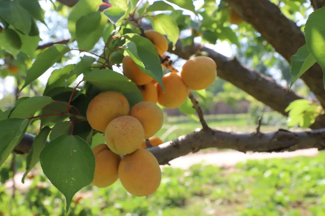 隔著不遠(yuǎn)處的杏子也熟了,夏日里,杏子的金黃,在綠蔭庭院,有一種醒目的美好。不覺流光易,枝頭杏子黃,滿樹金黃,鮮杏飄香!